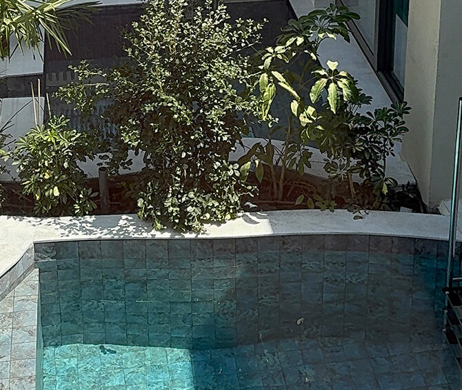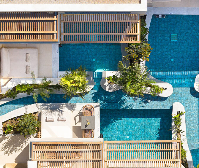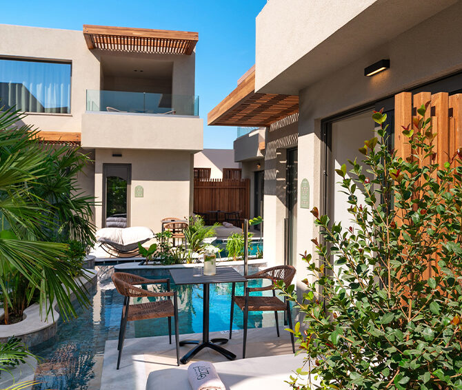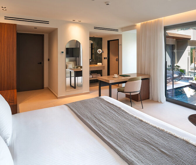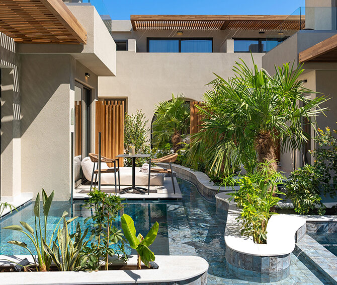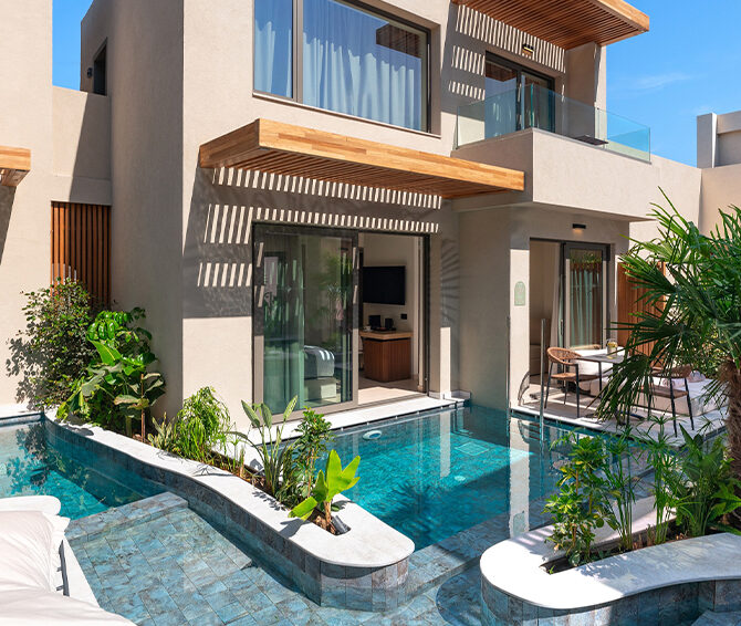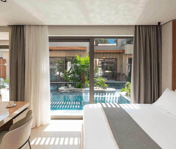 The Deluxe Triple Rooms with Heated Swim Up Pool are located on the ground floor of the hotel’s main building, offering direct access to the pool, creating a cool and serene atmosphere.