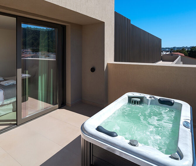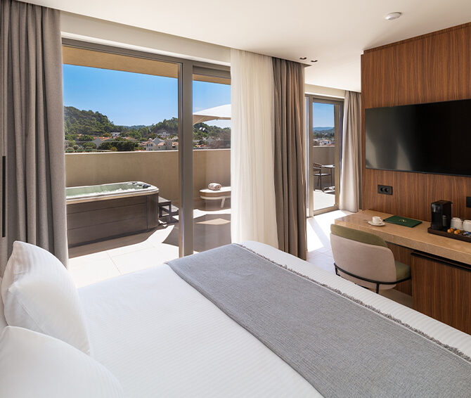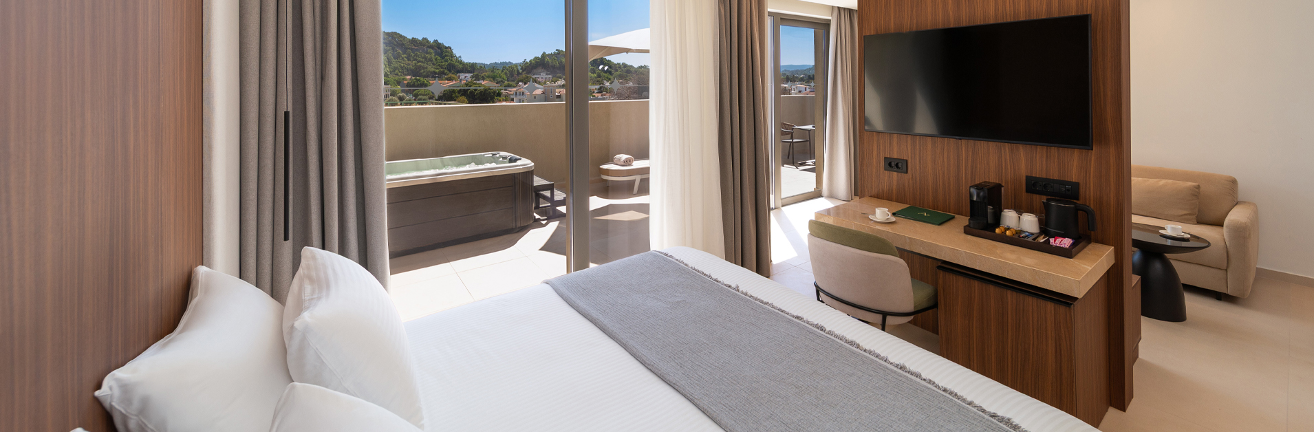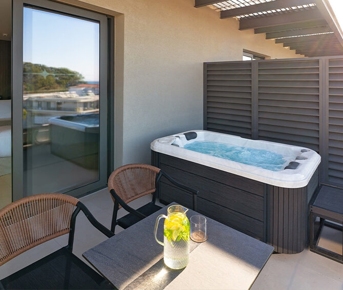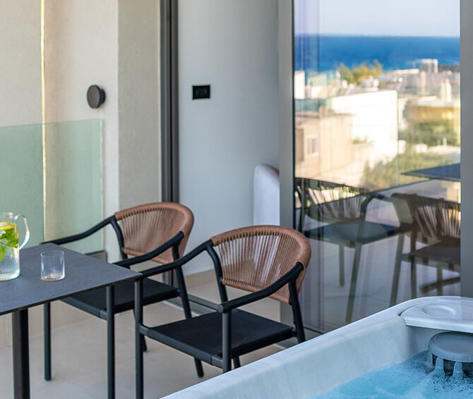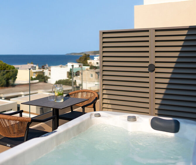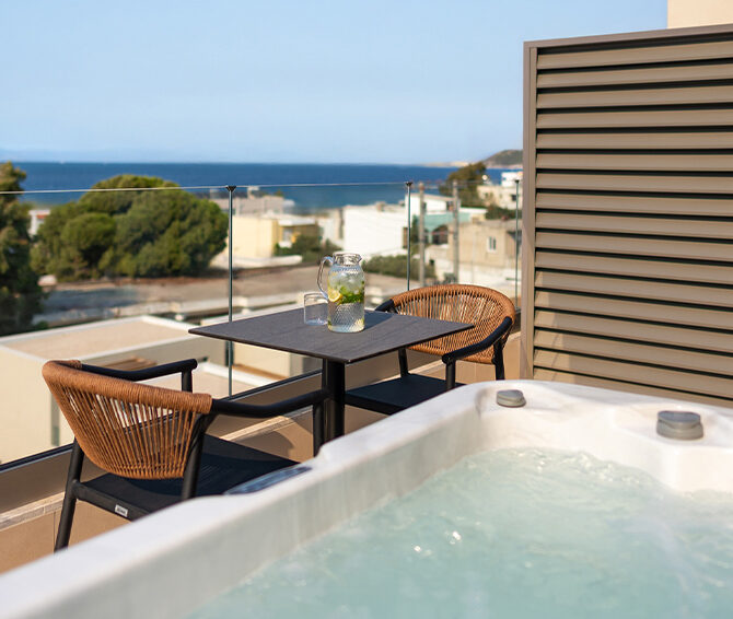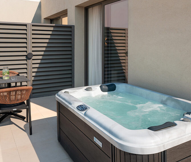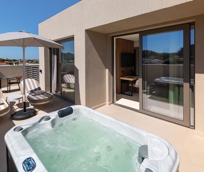 The Jacuzzi Luxury Suite offers an unparalleled escape into relaxation and romance, featuring a private jacuzzi on a tastefully furnished terrace and evokes the atmosphere of a private spa.