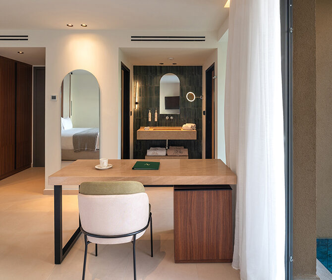 The Pool View Luxury Suite offers modern accommodation with a stunning view of the pool. Located on the first floor of building B, it seamlessly blends elegance, comfort and a relaxing atmosphere.