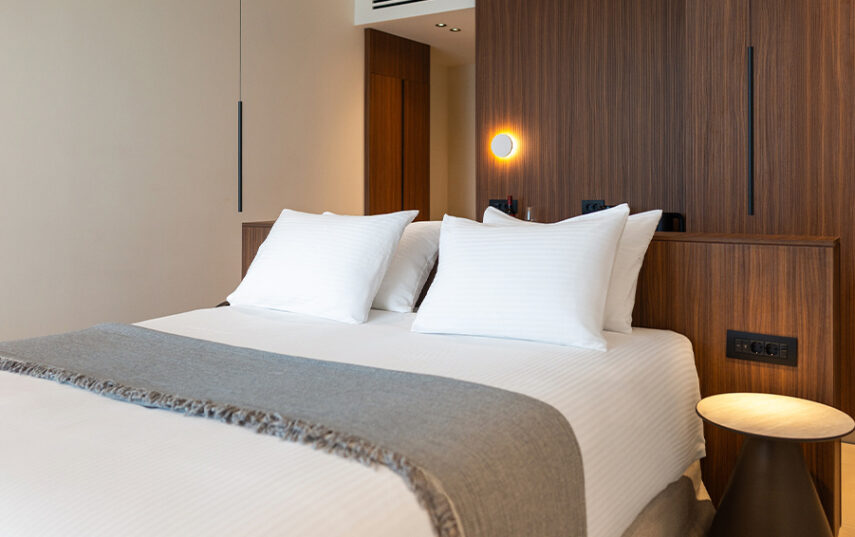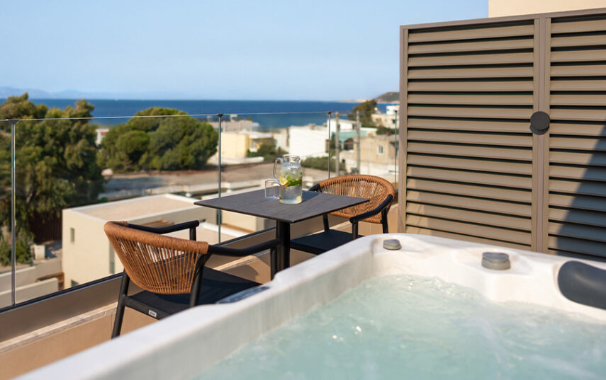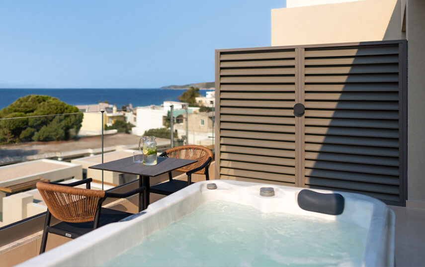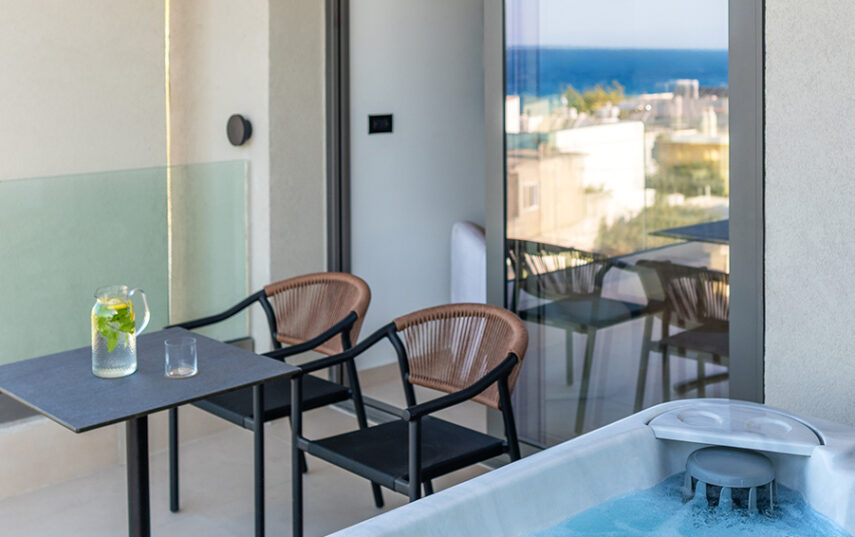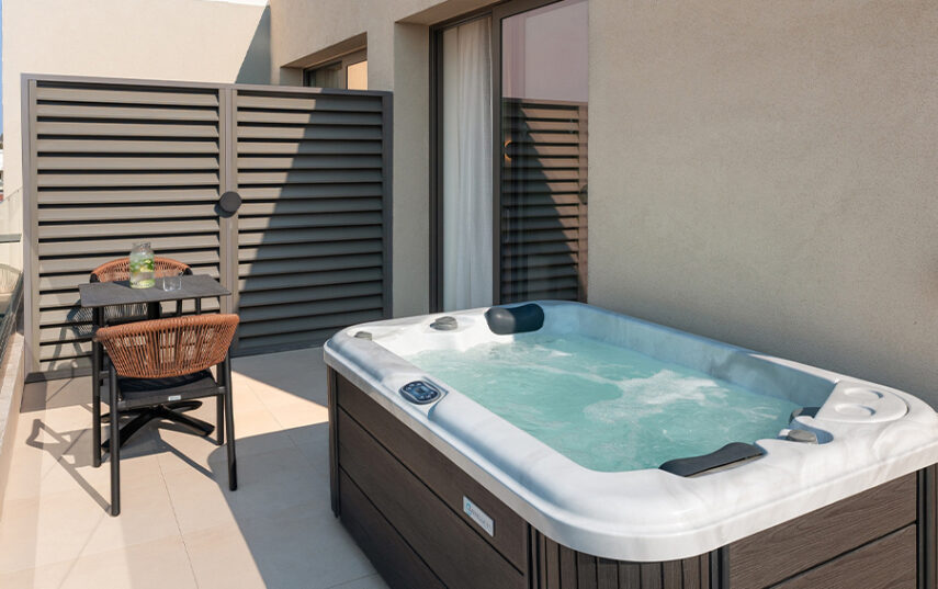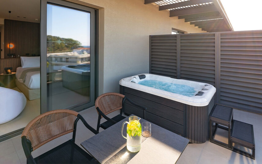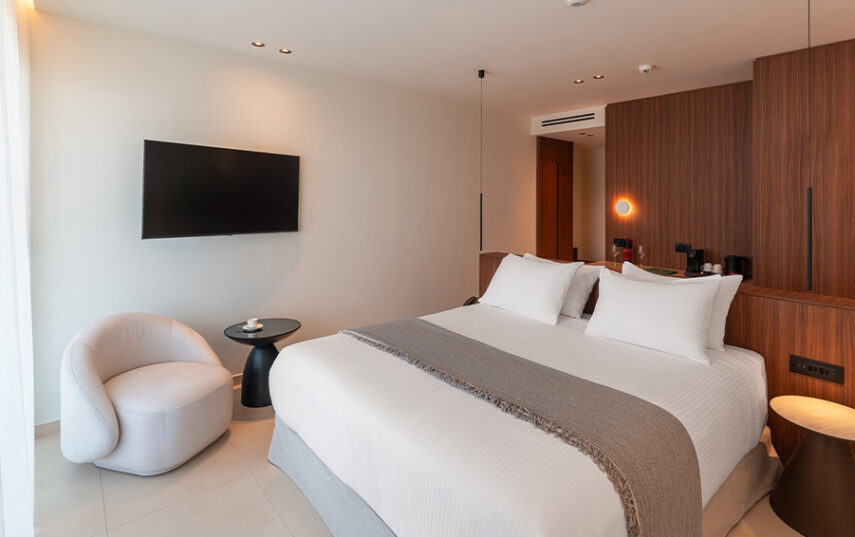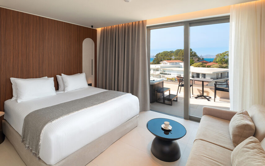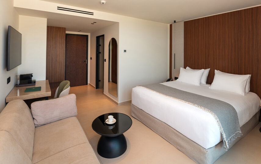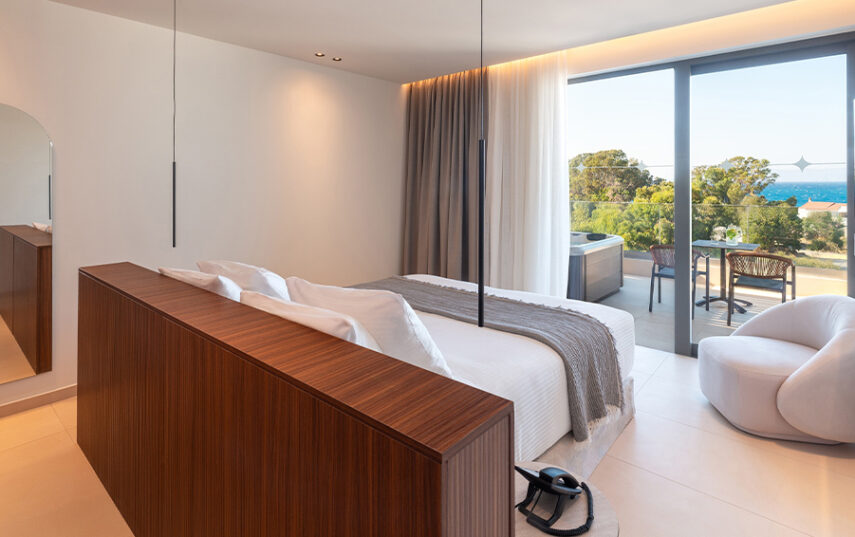 Comfortable king-size bed or twin beds with high-quality mattresses and luxurious linens, modern bathroom with a walk-in shower and premium toiletries. Free Wi-Fi, a Nespresso coffee machine, a kettle and a coffee set for refined moments are also included. Plush bathrobes and slippers add extra comfort, along with a furnished private terrace with direct access to the swim up pool. An excellent choice for those who wish to enjoy the tranquility of the pool, the coolness of the shade and the unique feeling of relaxation by the water, all within an elegant and spacious setting.