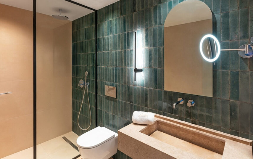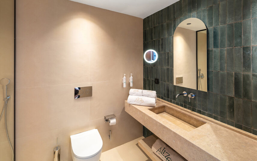 Here, you can enjoy your coffee or drink in a tranquil setting, right by the water’s edge, surrounded by the most sheltered and shaded atmosphere—perfect for those seeking a cool retreat from the sun. The interior design of the room features soft earthy tones and modern touches, creating an elegant and welcoming atmosphere.