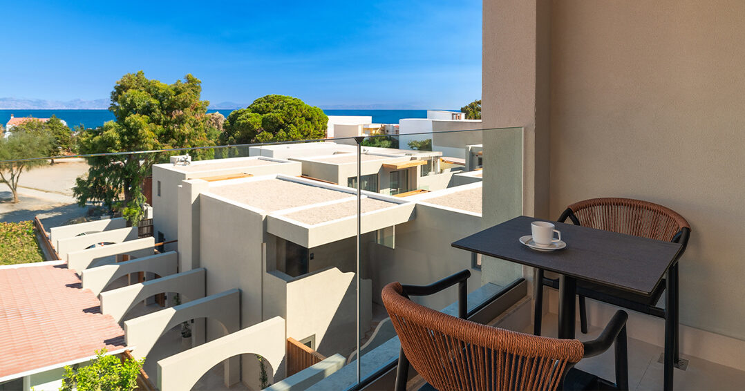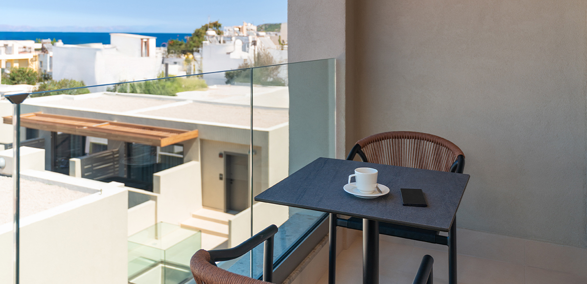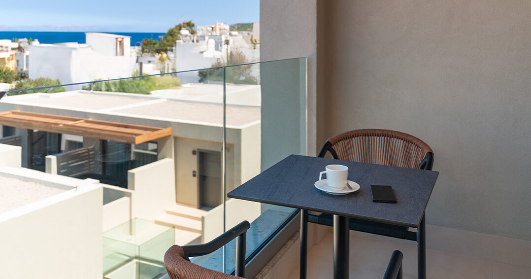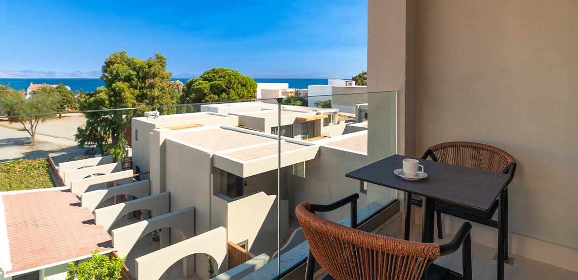With sweeping views of the endless sea and the island’s breathtaking sunset, the Deluxe Triple rooms with sea views offer an unparalleled stay experience, blending luxury with the tranquility of the natural landscape. Located on the 3rd floor of the main building, they provide unobstructed vistas of the azure horizon. The fully furnished private balcony serves as the perfect spot to enjoy the mesmerizing sunset with a glass of wine or your morning coffee.