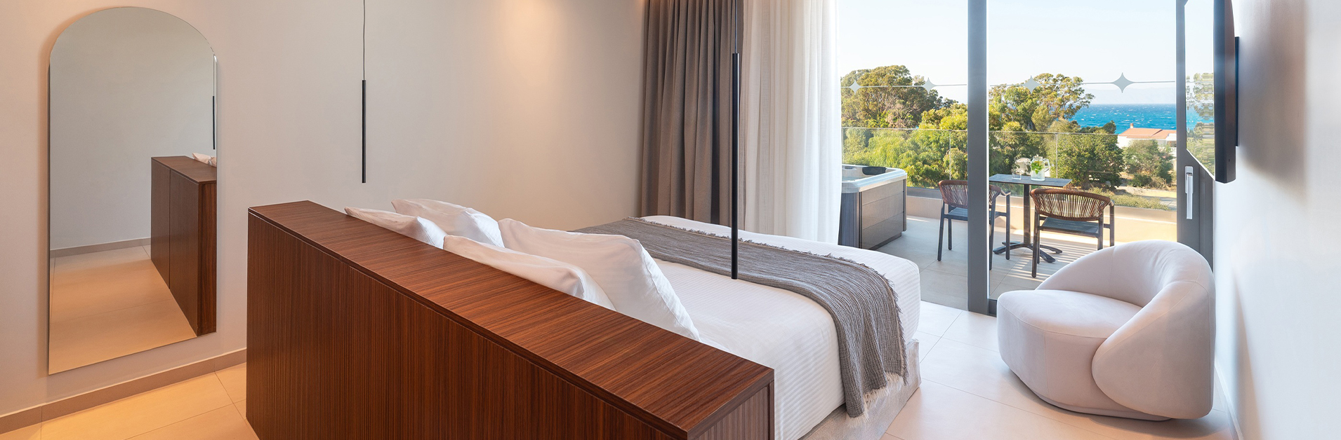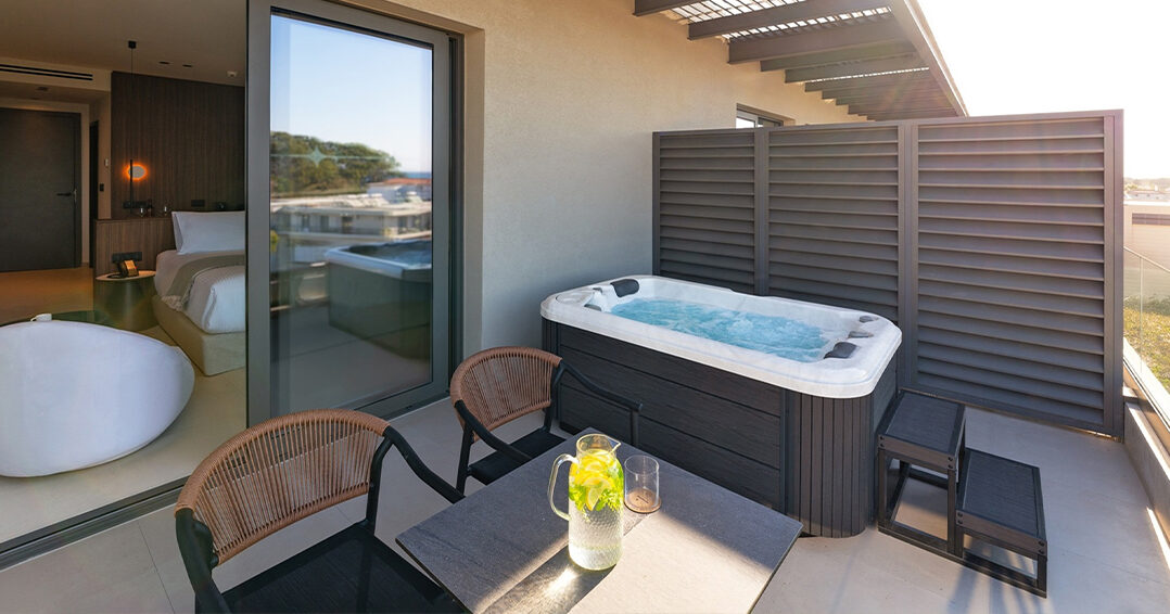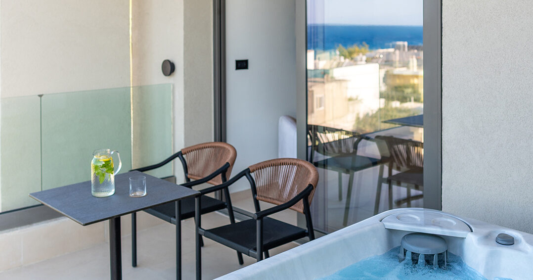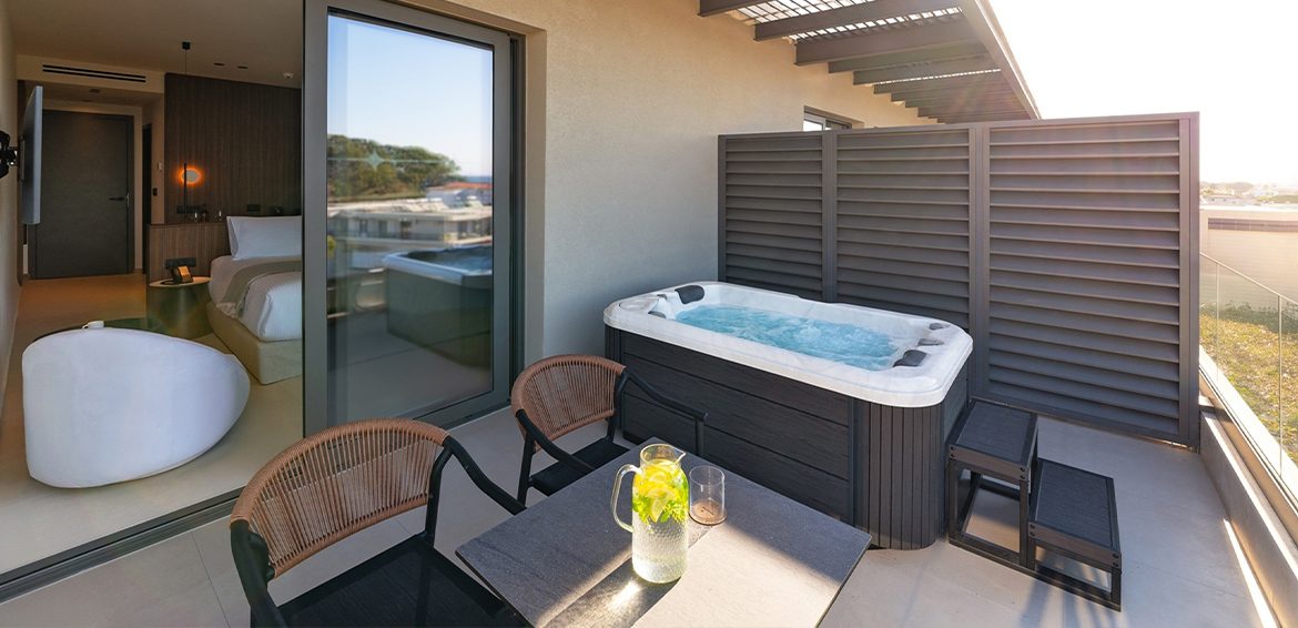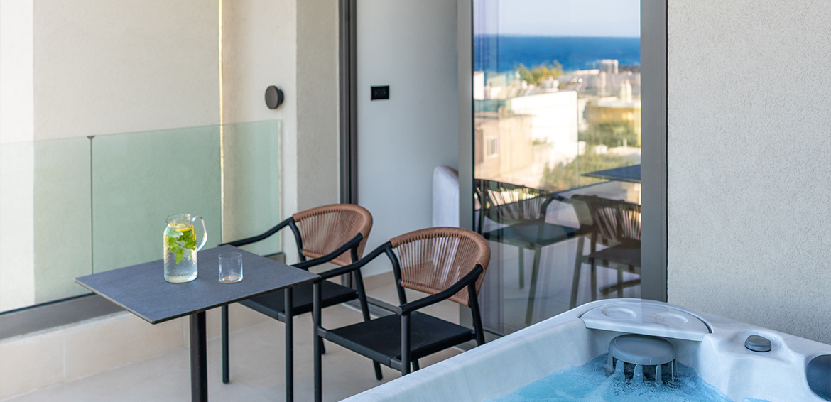 The uninterrupted sea view, paired with a private jacuzzi on the spacious, fully furnished balcony, creates the perfect setting for moments of relaxation and romance.