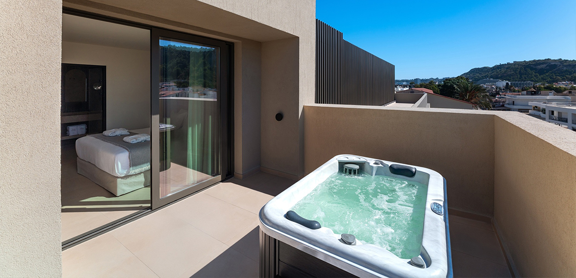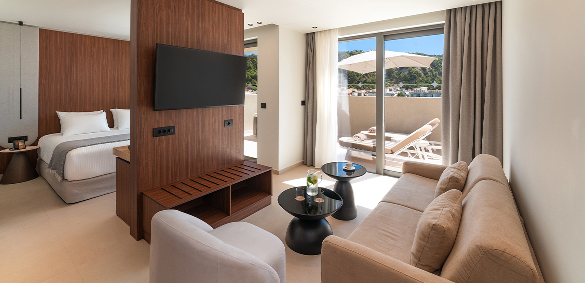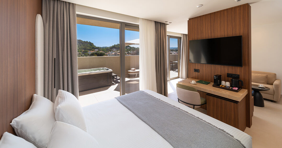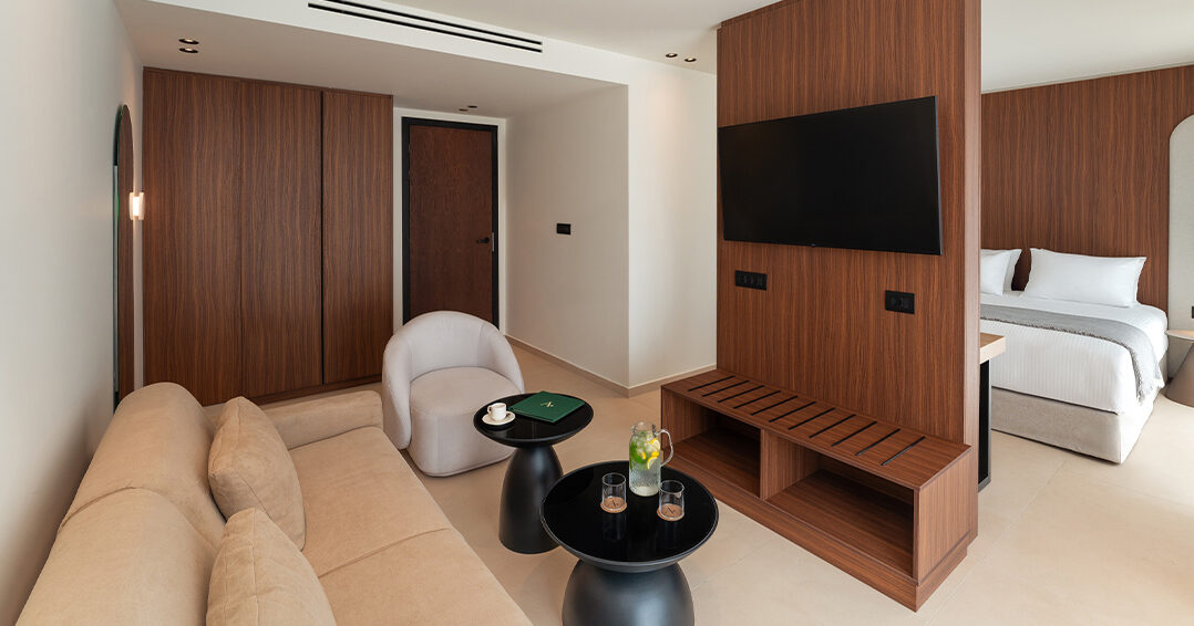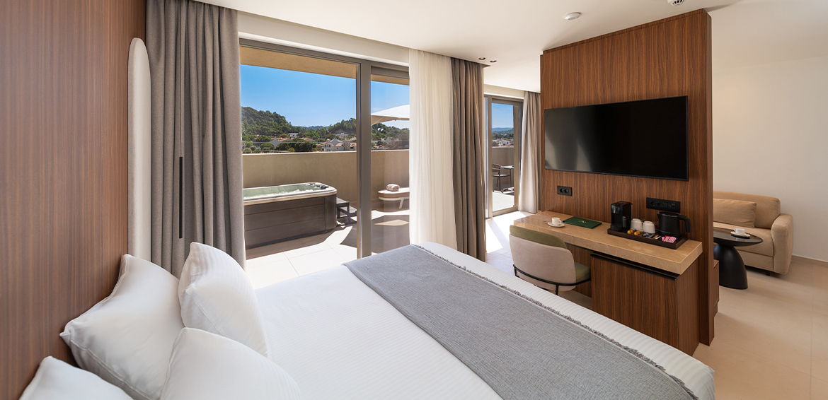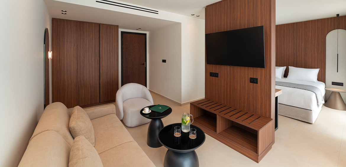 The 42m² Executive Suites with Jacuzzi offer a unique stay experience, seamlessly blending spaciousness, modern design and high-end comforts. Perched on the 4th floor of the hotel’s main building, they overlook the lush foothills of Filerimos Hill.