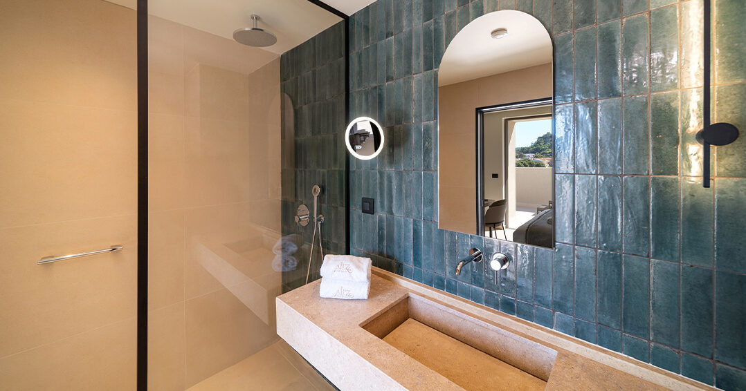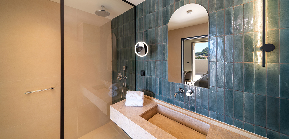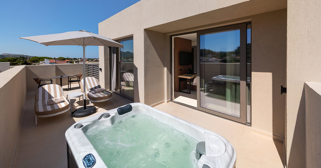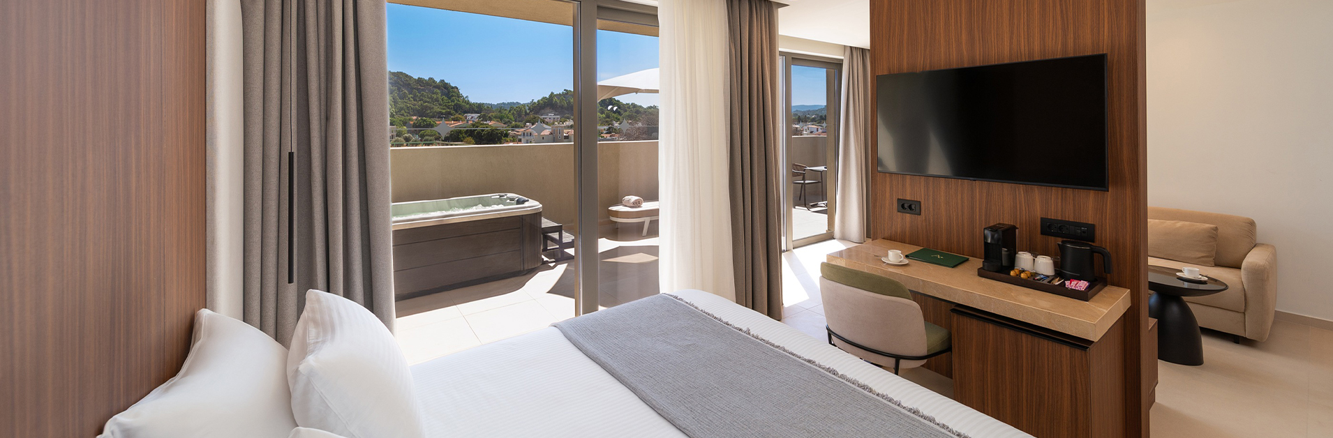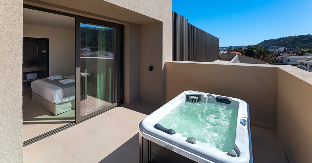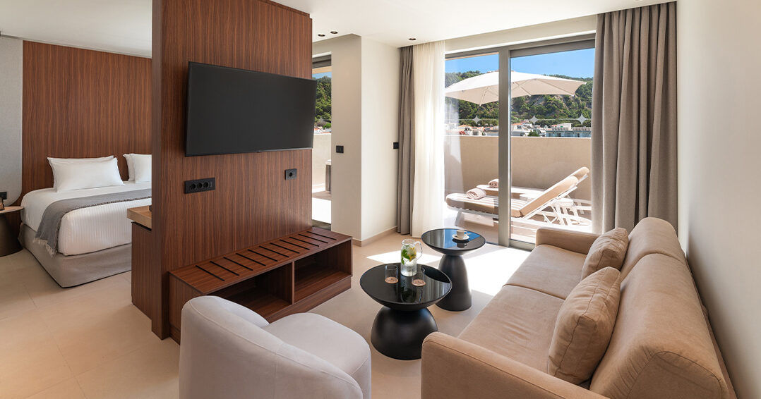 The 42m² Executive Suites with Jacuzzi offer a unique stay experience, seamlessly blending spaciousness, modern design and high-end comforts. Perched on the 4th floor of the hotel’s main building, they overlook the lush foothills of Filerimos Hill.